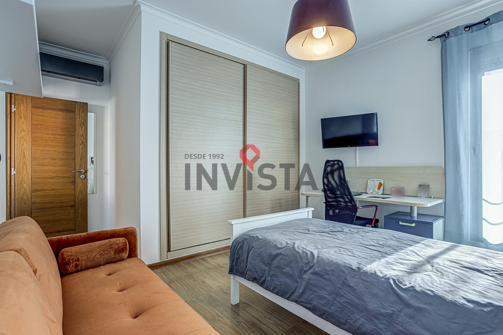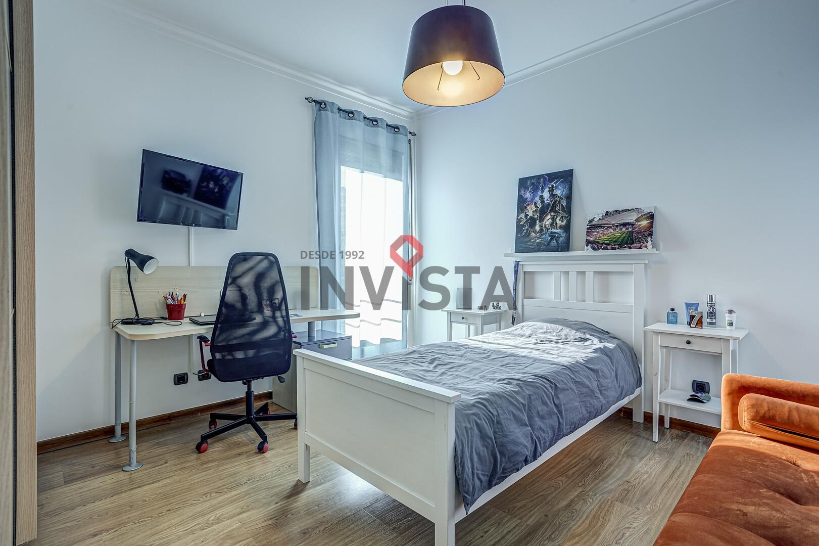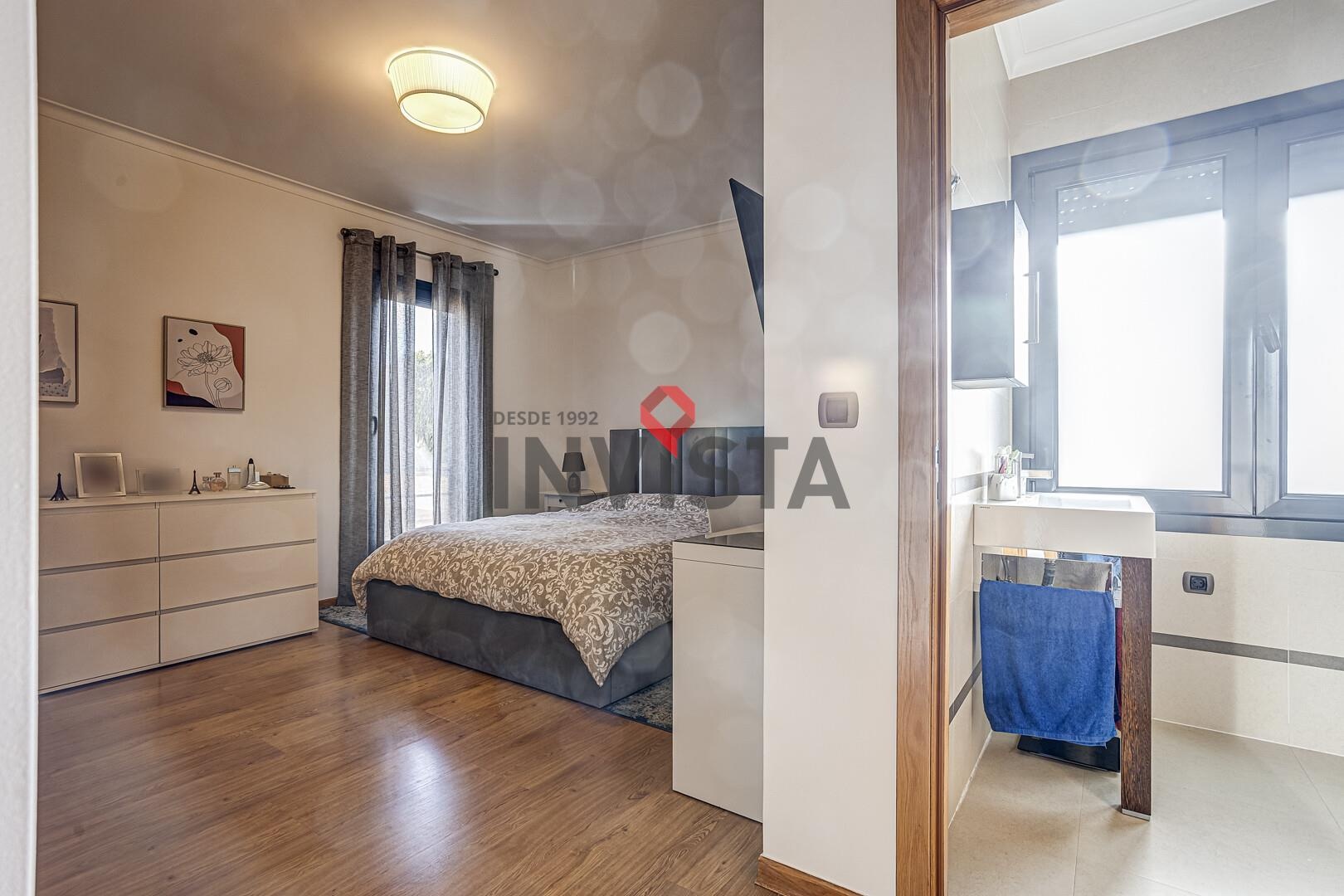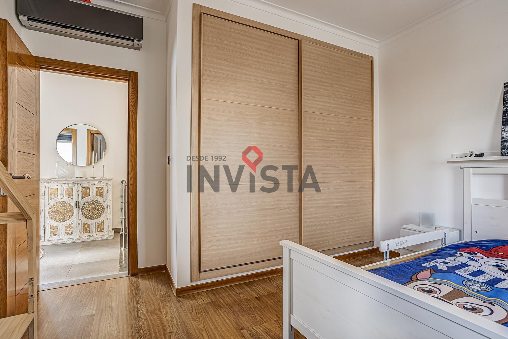 O piso superior é reservado à área privada, composta por três quartos bem dimensionados, incluindo uma suíte, todos com roupeiros embutidos, apoiados por instalações sanitárias completas. A circulação é fluida e funcional, garantindo conforto e privacidade.